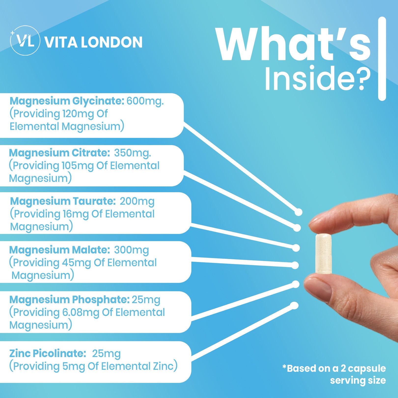Vita London’s Advanced Magnesium Complex delivers six carefully selected forms of magnesium in one high-strength formula, boosted with Zinc Picolinate for added support. Each serving provides 1475mg of magnesium compounds, designed for easy absorption and everyday use.
