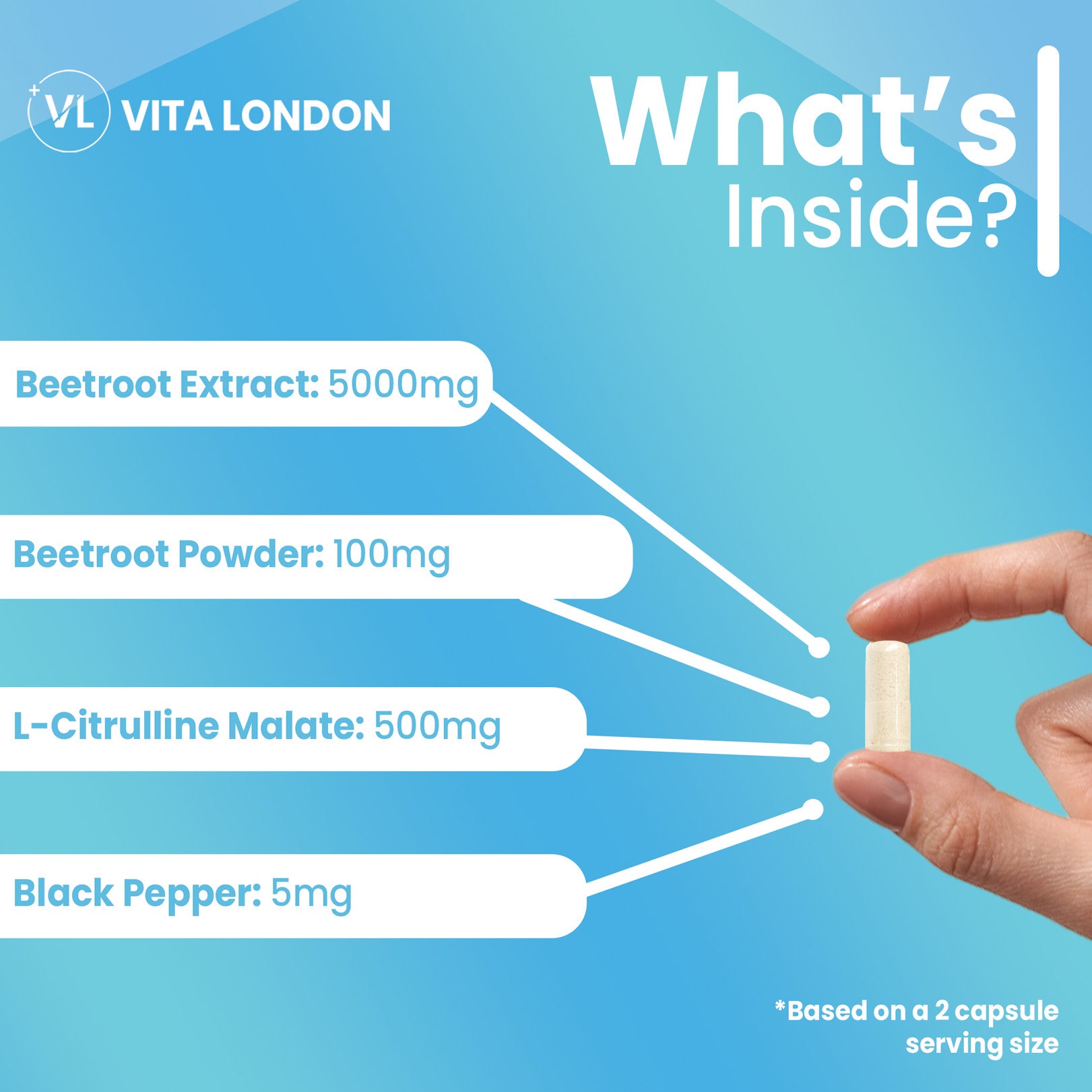 L-Citrulline Malate, Brown Rice Flour, Hydroxypropyl Methylcellulose (capsule shell), Beetroot Extract, Beetroot Powder, Silicon Dioxide, Magnesium Stearate, Ground Black Pepper.