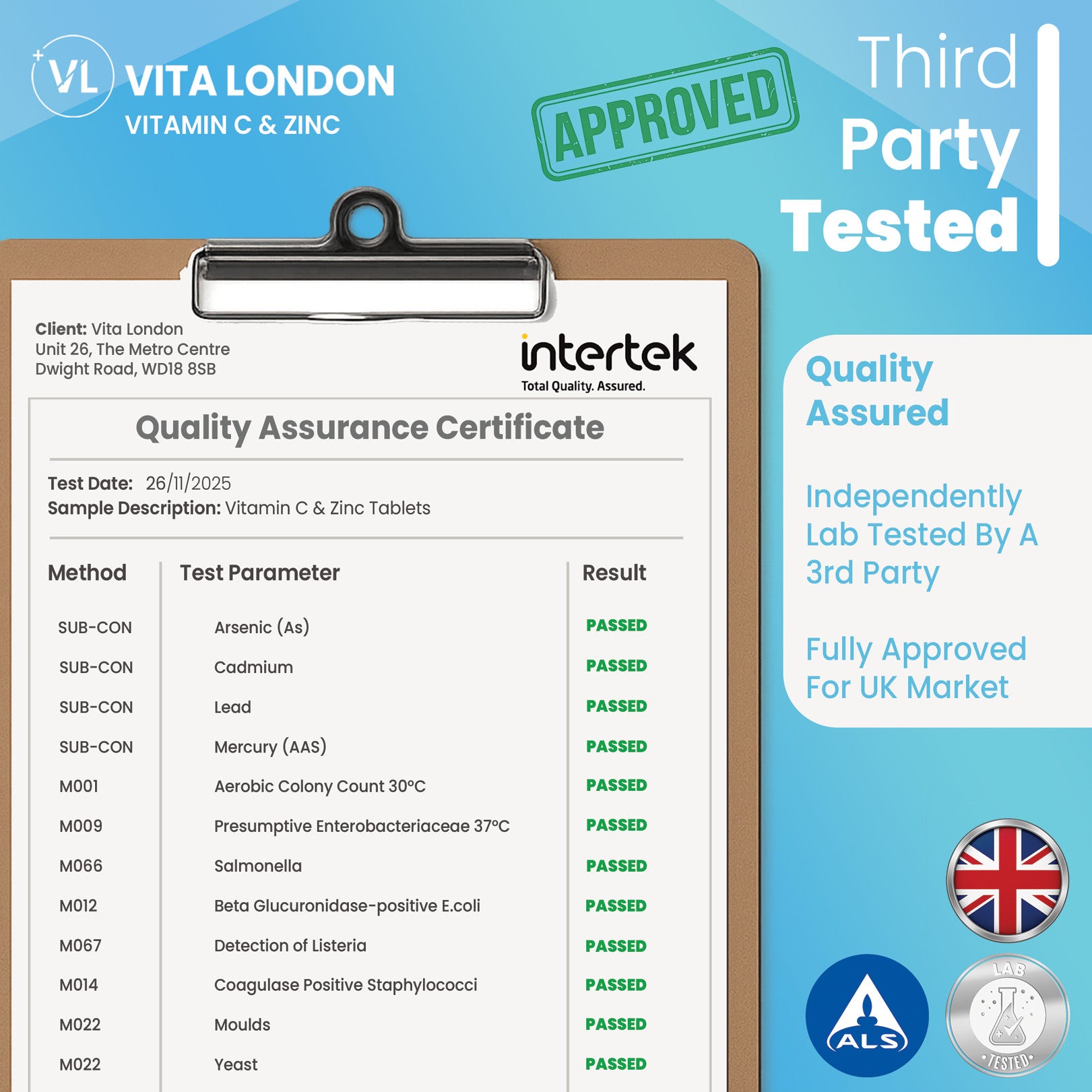 Vita London’s Vitamin C & Zinc Tablets provide a daily serving of 100mg Vitamin C and 20mg Zinc in a compact, easy-to-swallow tablet. This food supplement is suitable for vegans and vegetarians and is manufactured in the UK.